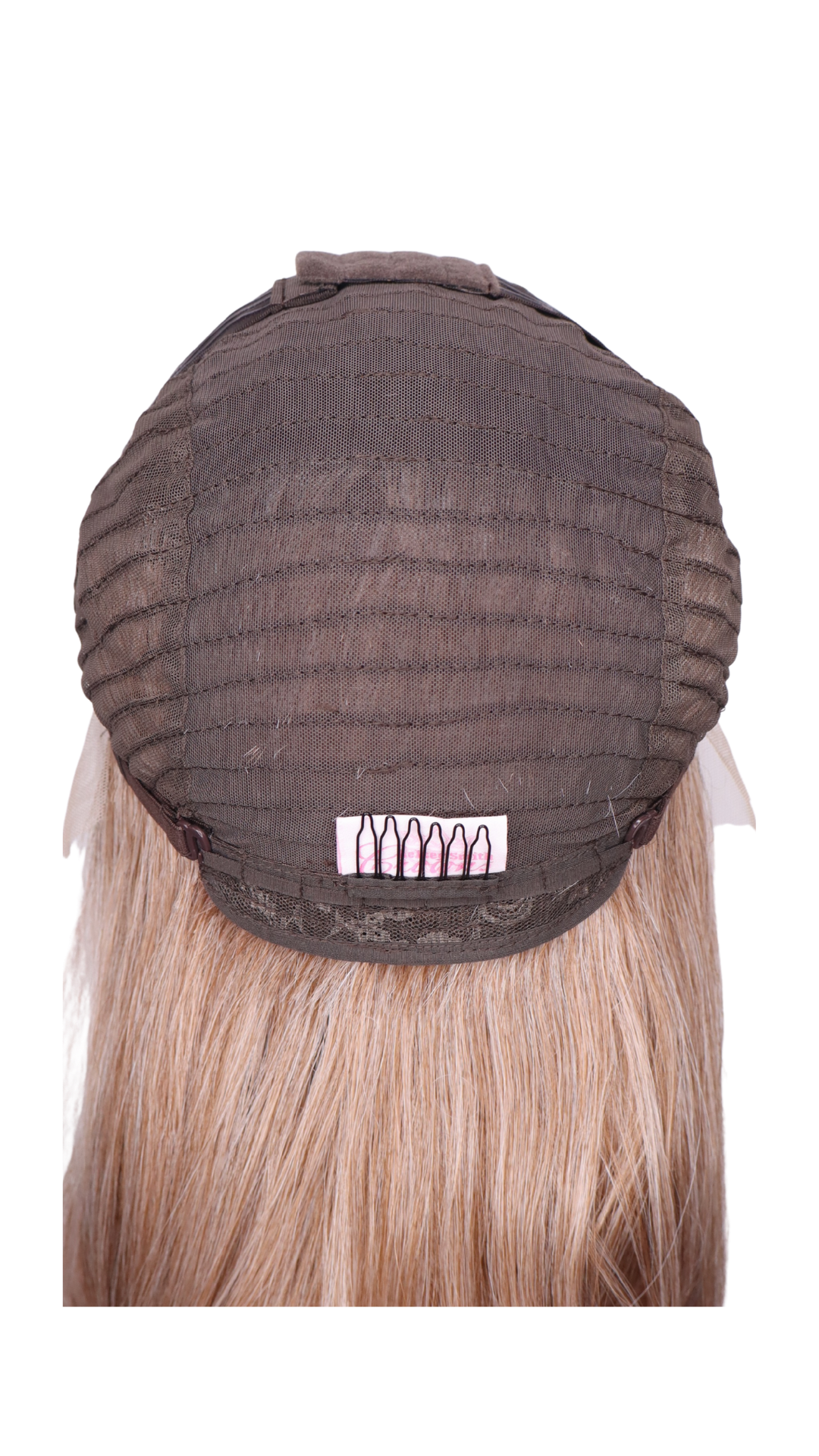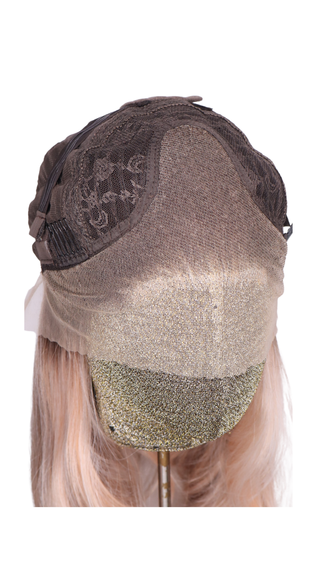 Pinky apricot with dark apricot lowlights, light apricot highlights and a brown shadow root and a Scandinavian hairline