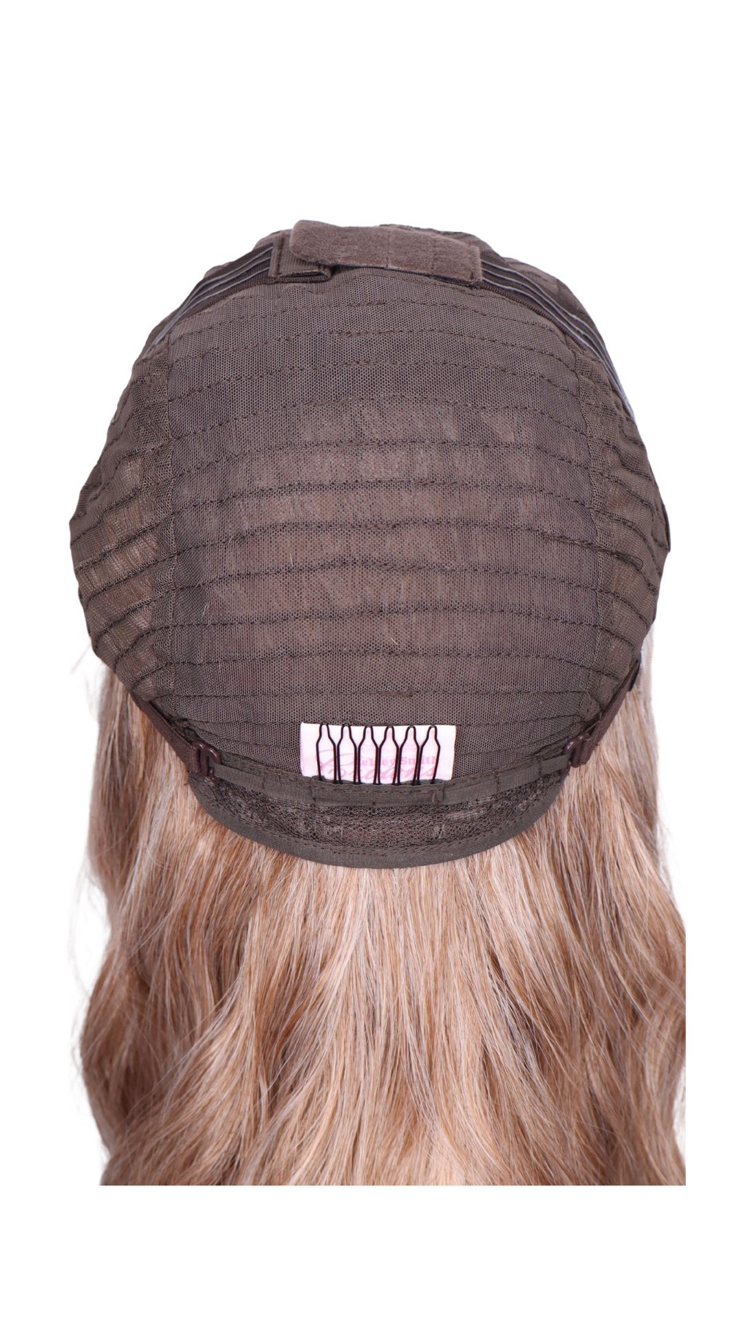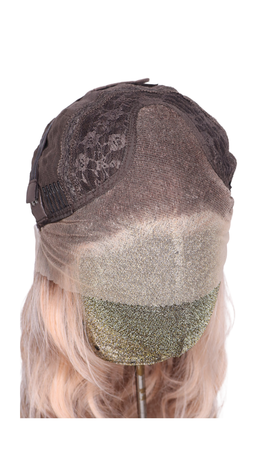 Pinky apricot with dark apricot lowlights, light apricot highlights and a brown shadow root with a Scandinavian hairline