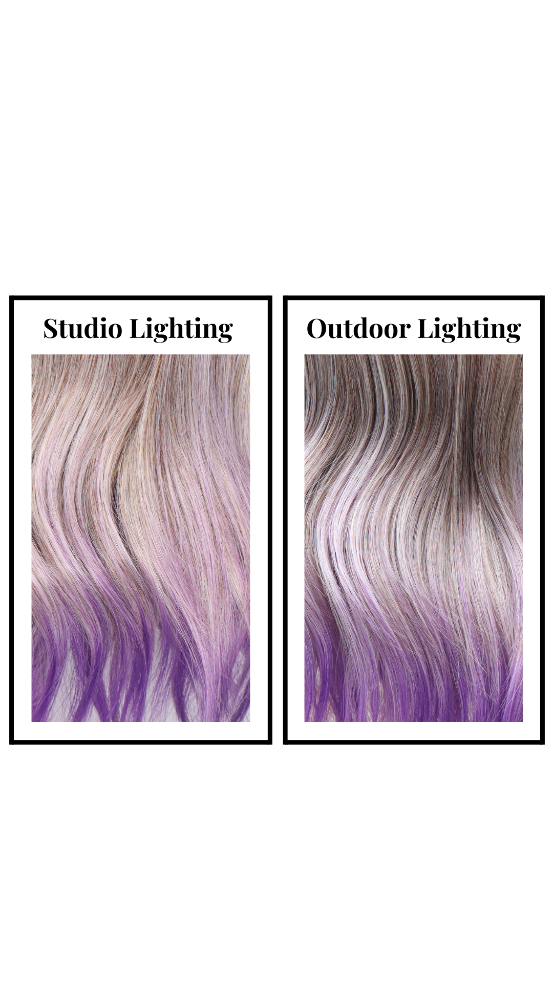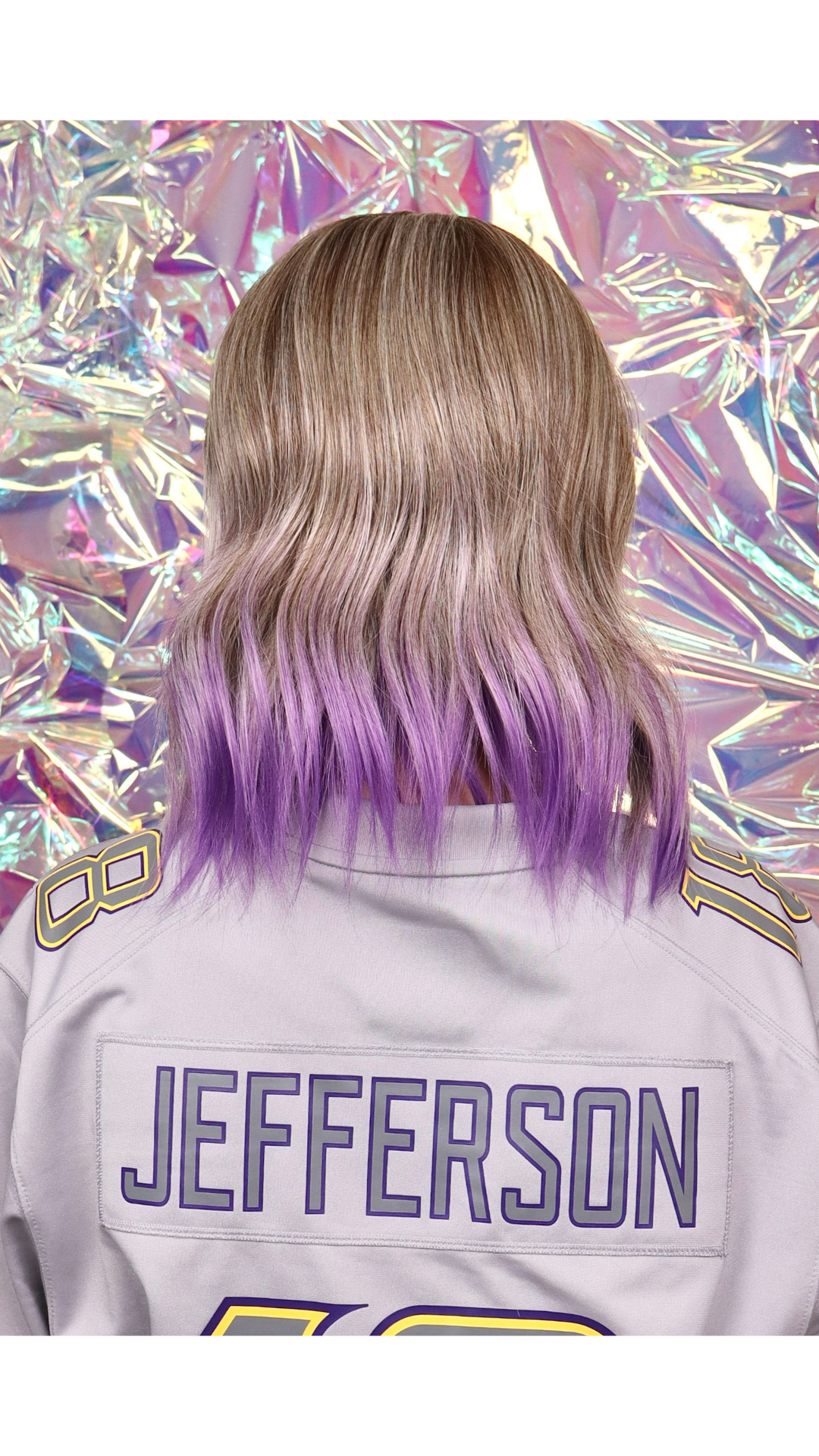 A soft ash blonde base melts into a vivid violet gradient, intensifying into rich purple at the ends for a bold yet ethereal finish with a Scandinavian hairline